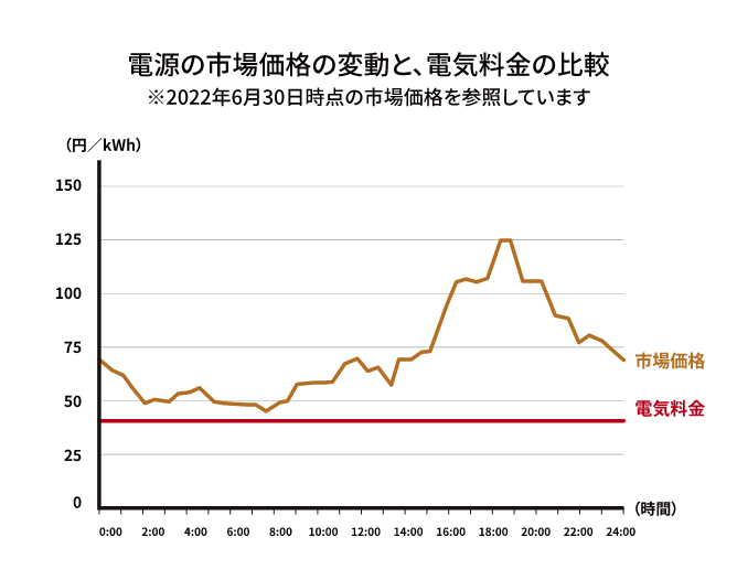 そもそも電気料金は一般的に時期や時間帯に左右されず一律価格です。仕入原価が季節・天候・時間帯によって大きく変動するにも関わらず、最終ユーザーである私たち電力需要家との間に市場原理が働いていないため、合理的なシステムとは言えません。
