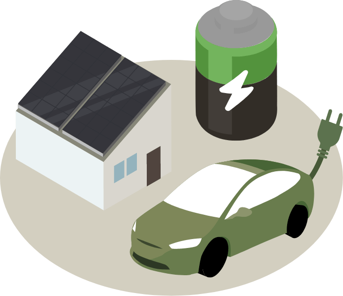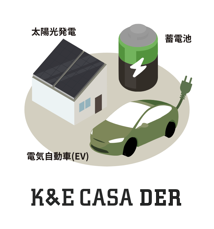 GXプラットフォームの最小単位は、一般家庭需要。K&Eの住宅事業である「K&E CASA」は、DER(太陽光発電/蓄電池/EV)を搭載した低燃費住宅をプロデュースし、経済合理性が高い「自立・分散型電源システム」を提供しています。