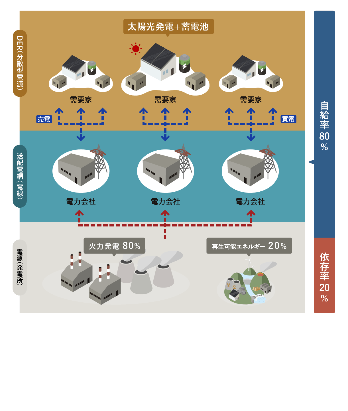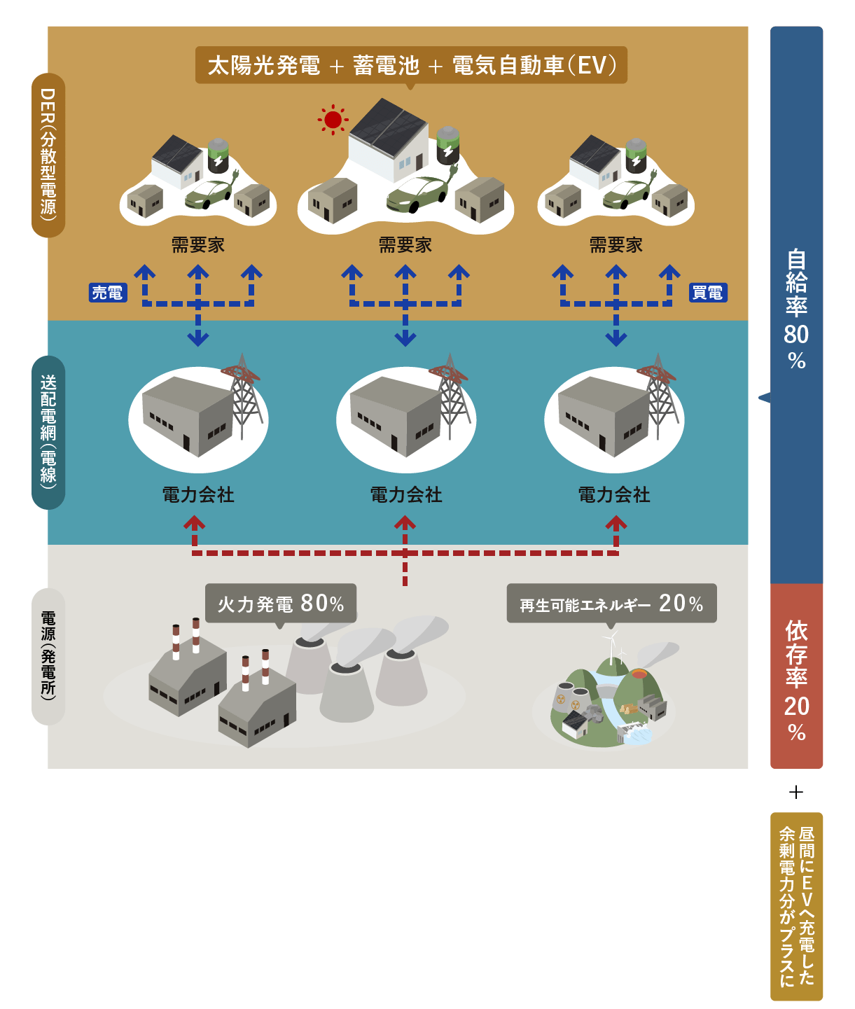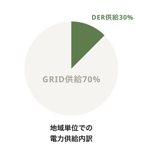 また、DERの昼間の余剰電力、夜間需給ひっ迫時のVPPでGRIDへ売電することで貢献し、DER×VPP×GRIDのベストミックスで地域のエネルギー自給率を最大化します。