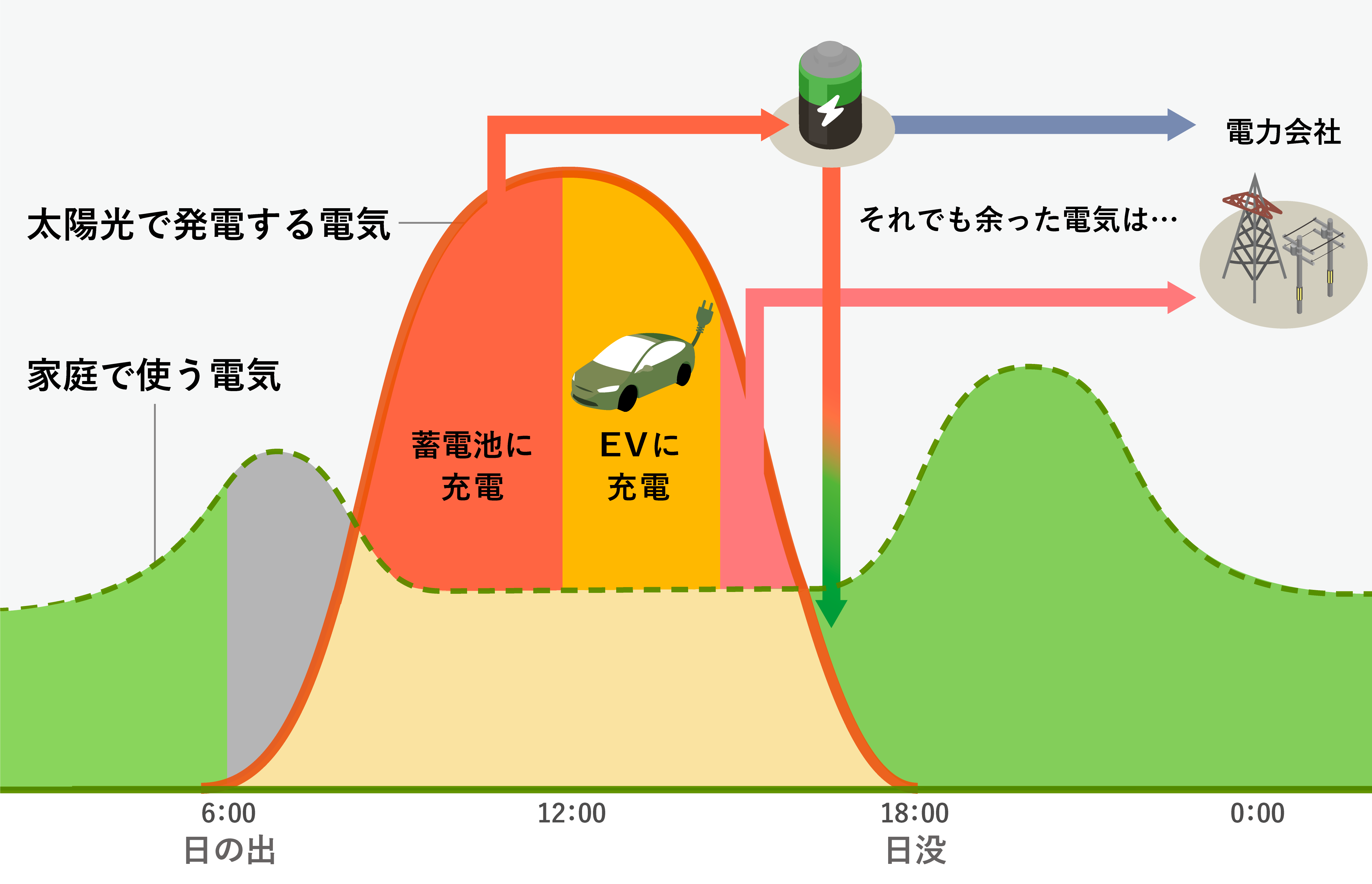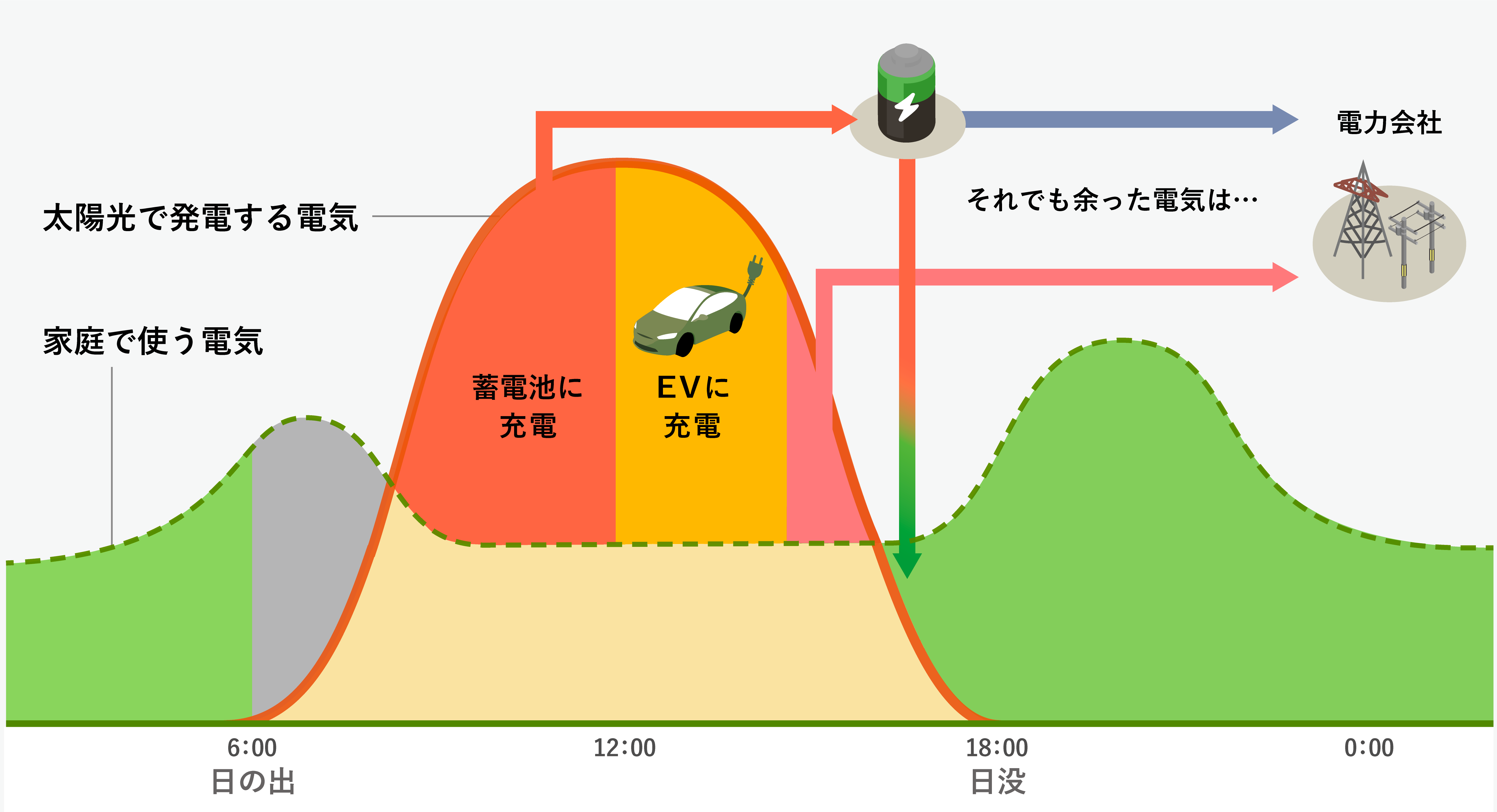 これまでは気まぐれな電力需要に対して火力発電の電力供給が追従することで合わせていましたが、これからは昼間の太陽光発電による電力供給に対して電力需要をどう合わせるか、という考え方に変えていくことで合理的なエネルギーの利用が可能になります。