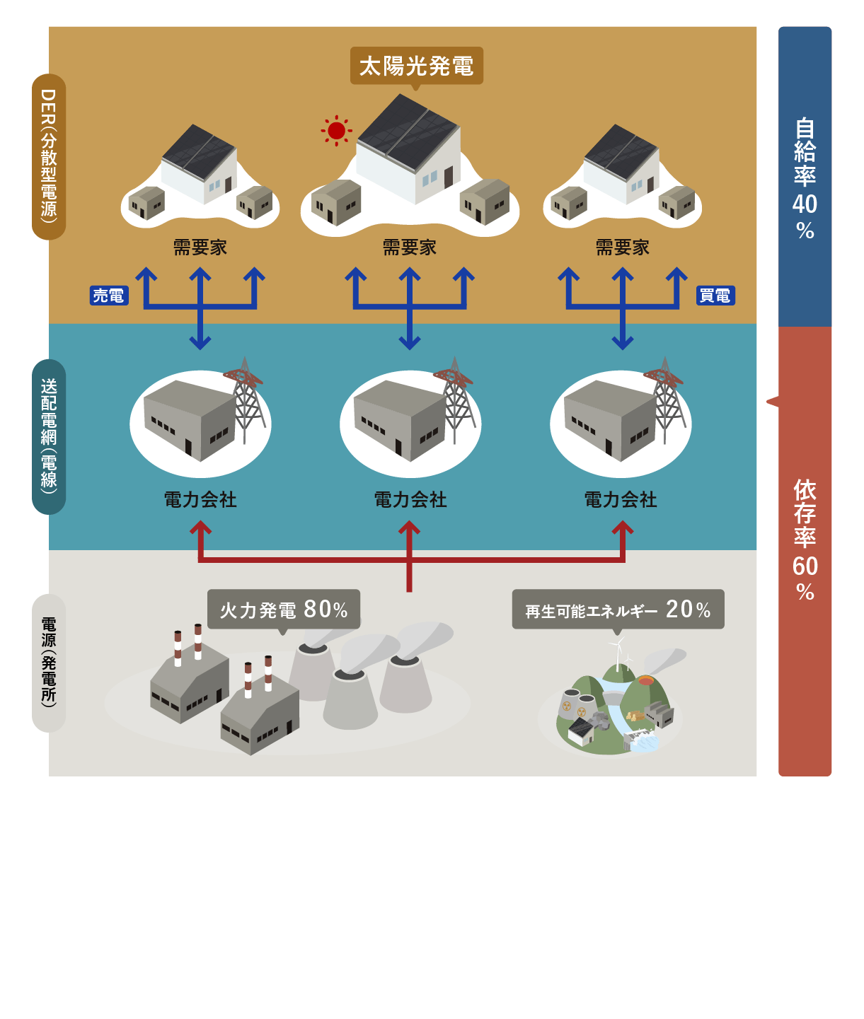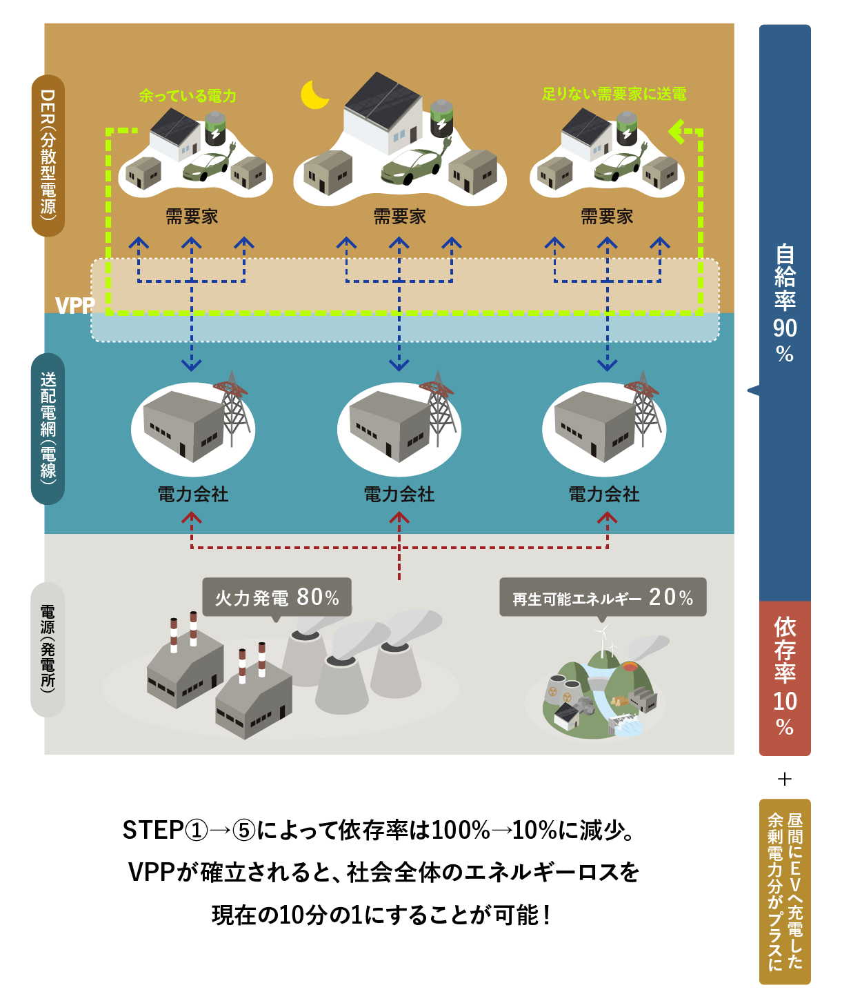 私たち需要家自身がDER(分散型電源)を持ち、太陽光発電/蓄電池/EVの活用によって電力自給率を向上させ、最終的にはDERを制御することによってVPP(仮想発電所)を確立。化石燃料依存からの脱却を目指します。