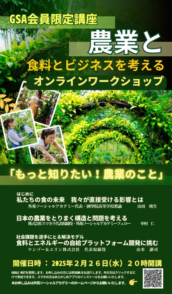 その取り組みの目的と意義、具体的なアプローチ方法について、2月26日に外苑ソーシャルアカデミー(GSA)のオンライン講座、農業と食料とビジネスを考える 会員限定オンライン講座にて紹介させていただくことになりました。